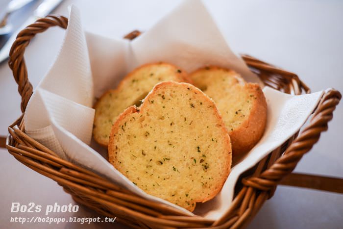 切片的法國麵包塗上大蒜,鹹香的滋味很不錯,沾濃湯吃也別有一番味道。