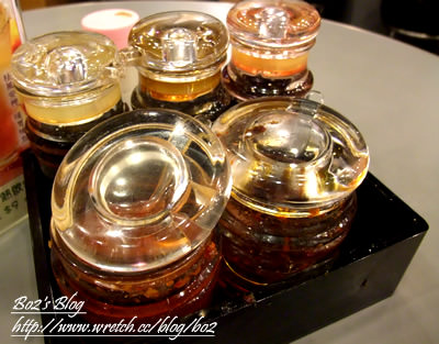桌上擺了的各式調味醬..種類還真不少…透明的罐子讓普通的醬料.也可以看起來很特別…——————簡而言之…這牛丸的確是有它的獨特性…