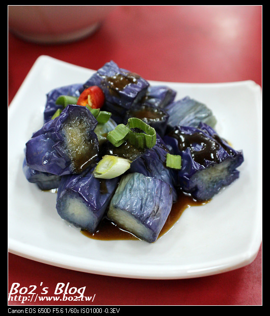 水煮茄子看似漂亮,但如果無沾醬的話,本身是沒什麼味道。