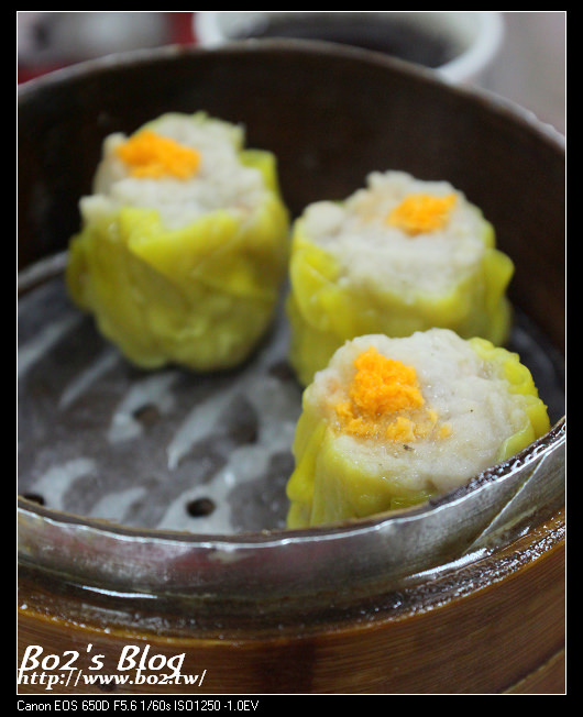燒賣一籠三顆,除了上面點綴的蟹黃,燒賣內還包了一整隻蝦子,