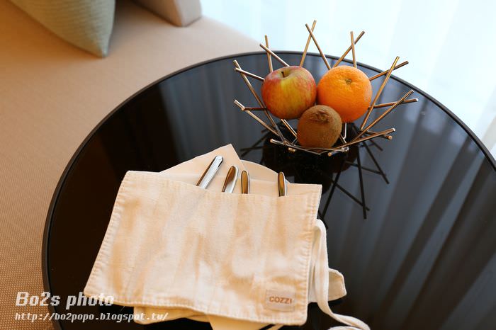 落地窗旁的茶几有迎賓水果,還附有小刀叉之類的餐具。