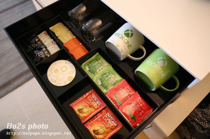 衣櫃旁的抽屜內有咖啡包/茶包,還有玻璃杯熱水瓶等等。